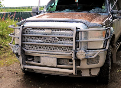 km 354: The only treacherous part of the drive was the southbound descent to the Eagle River. The mud got slicker and deeper as we rounded the corner. It's a couple of kilometres down ... if 6 tons gets sliding sideways on a downgrade inertia takes over, stay center, 5 - 10 km/hr, bull low, 4x4, limited slip front, locking rear axle. One truck in the ditch and we heard that other vehicles went off later in the day.
